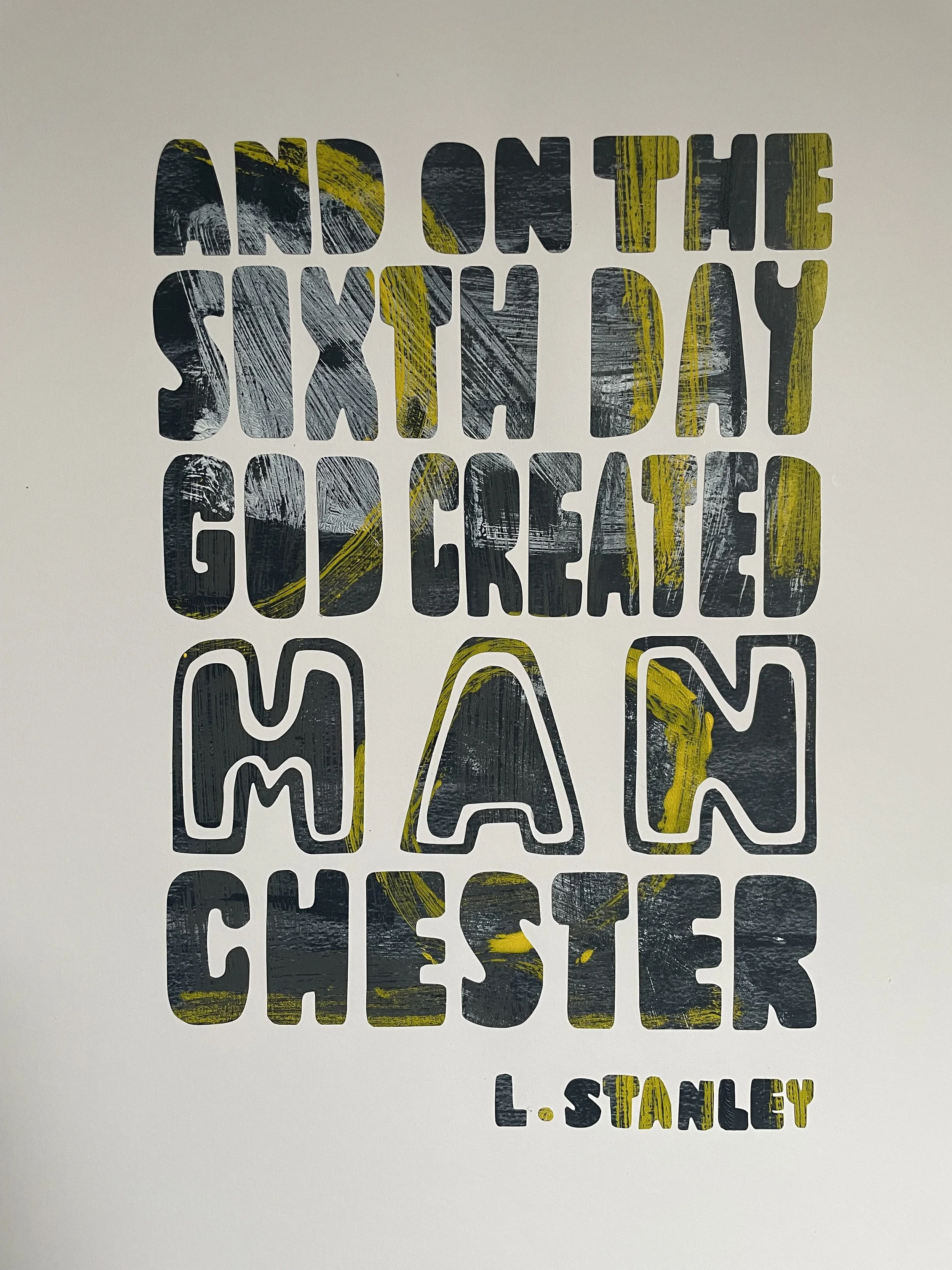 The images are built up using layers of acrylic paint using a variety of painting and printing techniques. The surfaces created have also been used to collage quotes by notable Mancunians, reconstructing the surface through the words that are woven through our history.